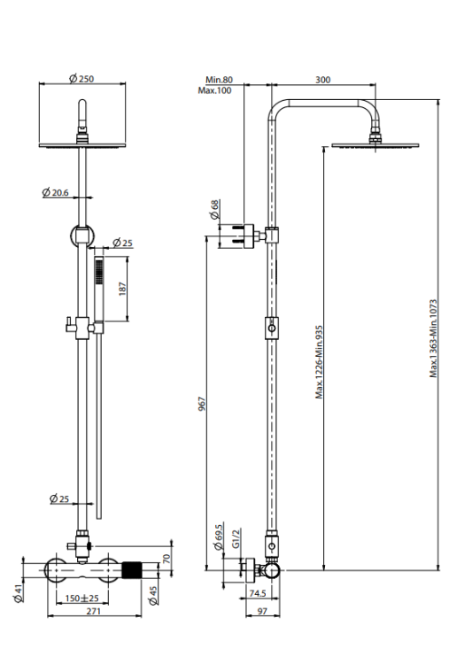 Душевая стойка, Fima Carlo Frattini, Shower column, верхний душ-есть, форма верхнего душа-круглая, размер верхнего душа,мм-250, держатель верхнего душа-есть, вынос, мм-300, размер штанги, мм-1073-1363, ручной душ-в комплекте, шланг-есть, размер шланга, мм-1500, переключатель, 2 подвода воды 1/2 с эксцентриком, цвет-брашированный никель Душевая стойка, Fima Carlo Frattini, Shower column, цвет-брашированный никель