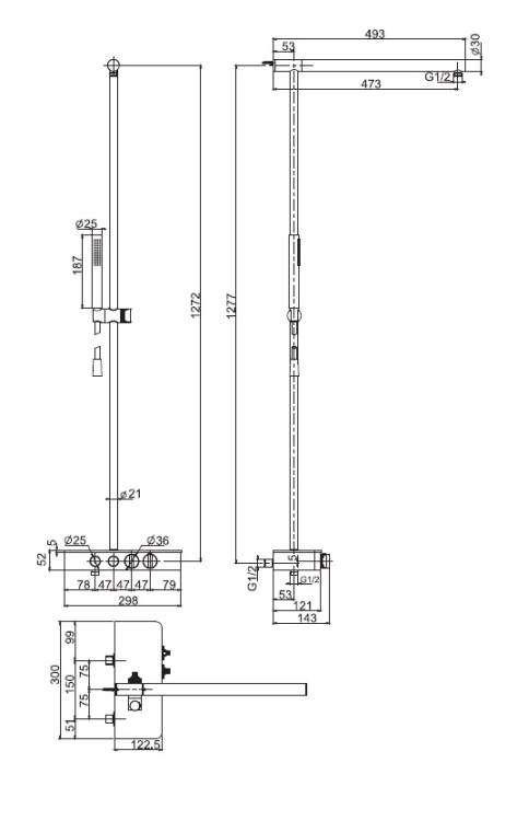 Душевая стойка, Fima Carlo Frattini, Switch, основа из сатинированного стекла черного цвета, смеситель-в комплекте, тип открывания воды-вентильный, тип регулирования воды-термостатический картридж, верхний душ-необходимо заказать, держатель верхнего душа-есть, вынос, мм-493, размер штанги, мм-1277, ручной душ из ABS-в комплекте, шланг-есть хромалюкс, размер шланга, мм-1500, 2 подвода воды 1/2 с эксцентриком, цвет-черный матовый Душевая стойка, Fima Carlo Frattini, Switch, цвет-черный матовый