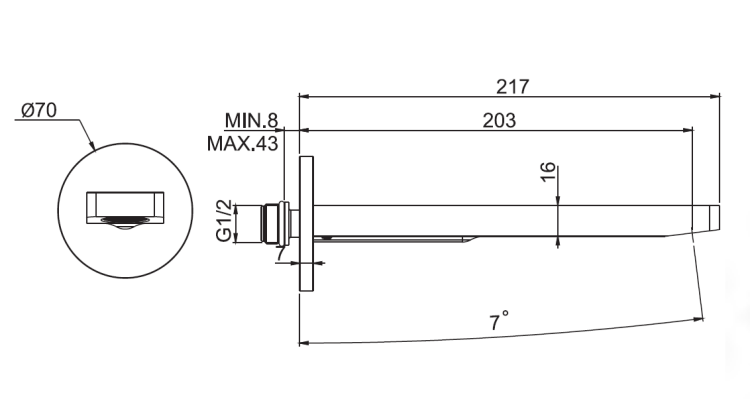 Излив, Fima Carlo Frattini, настенный, вынос излива, мм-201, стандарт подводки-1/2", цвет-золото Излив, Fima Carlo Frattini, цвет-золото