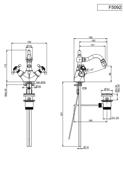 Смеситель для биде, Fima Carlo Frattini, Elizabeth, тип открывания воды-вентильный, отверстия для монтажа-1, высота, мм-173, вынос излива, мм-141, донный клапан-есть, тип подводки-гибкая, цвет-античная бронза Смеситель для биде, Fima Carlo Frattini, Elizabeth, цвет-античная бронза