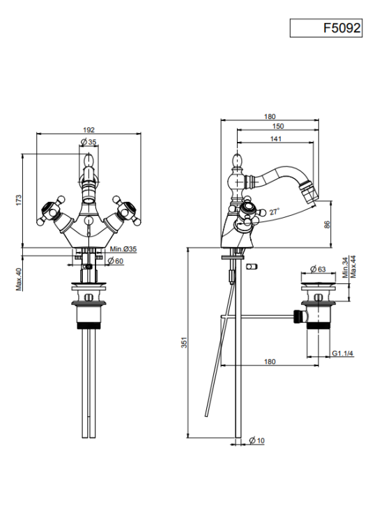 Смеситель для биде, Fima Carlo Frattini, Elizabeth, тип открывания воды-вентильный, отверстия для монтажа-1, высота, мм-173, вынос излива, мм-141, донный клапан-есть, тип подводки-гибкая, цвет-хром Смеситель для биде, Fima Carlo Frattini, Elizabeth, цвет-хром