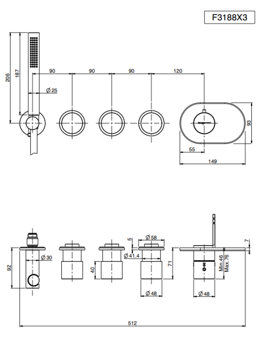 Смеситель для душа, Fima Carlo Frattini, Fimatherm, на 3 потребителя, тип открывания воды-вентильный, тип регулирования воды-термостатический картридж, монтаж-настенный встраиваемый, установка горизонтально, отверстия для монтажа-5, в комплекте-3 клапана контроля, настенный кронштейн с водоснабжением, ручной душ ABS с защитой от извести анти-кальк, гибкий шланг хромалюкс, мм-1500, внутренняя часть-необходимо заказать, цвет-черный матовый Смеситель для душа, Fima Carlo Frattini, Fimatherm, на 3 потребителя, цвет-черный матовый
