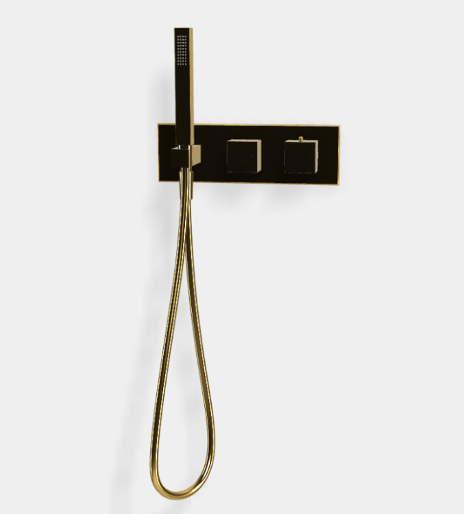Смеситель для душа, Fima Carlo Frattini, Fimatherm, на 2 потребителя, тип открывания воды-однорычажный, тип регулирования воды-термостатический картридж, монтаж-настенный встраиваемый, отверстия для монтажа-3, в комплекте-ручной душ с защитой от извести анти-кальк, держатель для душа с подводом воды, переключатель, гибкий шланг хромалюкс 1500 мм, внутренняя часть-необходимо заказать, цвет-золото Смеситель для душа, Fima Carlo Frattini, Fimatherm, на 2 потребителя, цвет-золото