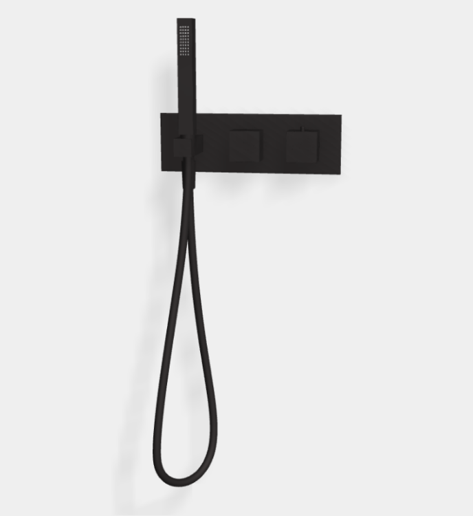 Смеситель для душа, Fima Carlo Frattini, Fimatherm, на 2 потребителя, тип открывания воды-однорычажный, тип регулирования воды-термостатический картридж, монтаж-настенный встраиваемый, отверстия для монтажа-3, в комплекте-ручной душ с защитой от извести анти-кальк, держатель для душа с подводом воды, переключатель, гибкий шланг хромалюкс 1500 мм, внутренняя часть-необходимо заказать, цвет-черный матовый Смеситель для душа, Fima Carlo Frattini, Fimatherm, на 2 потребителя, цвет-черный матовый