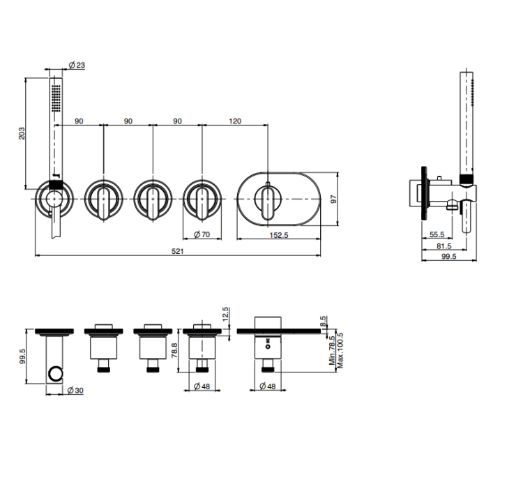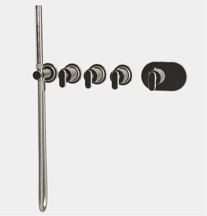 Смеситель для душа, Fima Carlo Frattini, Park Lane, на 3 потребителя, тип открывания воды-однорычажный, тип регулирования воды-термостатический картридж, монтаж-настенный встраиваемый, отверстия для монтажа-5, в комплекте-держатель для душа с подводом воды, ручной душ с защитой от извести анти-кальк, установка горизонтально, гибкий шланг хромалюкс, мм-1500, внутренняя часть-необходимо заказать, цвет-никель брашированный Смеситель для душа, Fima Carlo Frattini, Park Lane, на 3 потребителя, цвет-никель брашированный