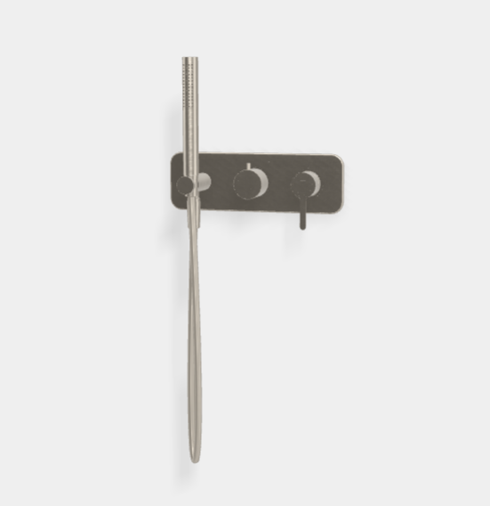 Смеситель для душа, Fima Carlo Frattini, Snap, на 2 потребителя, тип открывания воды-однорычажный, тип регулирования воды-керамический картридж, монтаж-потолочный, отверстия для монтажа-3, внутренняя часть-необходимо заказать, в комплекте-переключатель, держатель для душа с подводом воды, ручной душ с защитой от извести анти-кальк, гибкий шланг хромалюкс 1500мм, цвет-никель брашированный Смеситель для душа, Fima Carlo Frattini, Snap, на 2 потребителя, цвет-никель брашированный