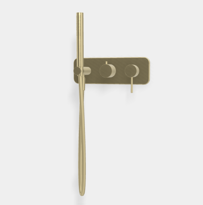 Смеситель для душа, Fima Carlo Frattini, Spillo Up, на 2 потребителя, тип открывания воды-однорычажный, тип регулирования воды-керамический картридж, монтаж-настенный встраиваемый, отверстия для монтажа-3, в комплекте-держатель для душа с подводом воды, ручной душ с защитой от извести анти-кальк, гибкий шланг хромалюкс, длина шланга, мм-1500, внутренняя часть-необходимо заказать, цвет-брашированный шампань Смеситель для душа, Fima Carlo Frattini, Spillo Up, на 2 потребителя, цвет-брашированный шампань