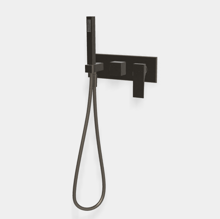 Смеситель для душа, Fima Carlo Frattini, Zeta, на 2 потребителя, тип открывания воды-однорычажный, тип регулирования воды-керамический картридж, монтаж-настенный встраиваемый, отверстия для монтажа-3, в комплекте-держатель для душа с подводом воды, ручной душ с защитой от извести анти-кальк, переключатель, гибкий шланг хромалюкс, длина шланга, мм-1500, внутренняя часть-необходимо заказать, цвет-брашированный черный хром Смеситель для душа, Fima Carlo Frattini, Zeta, на 2 потребителя, цвет-брашированный черный хром