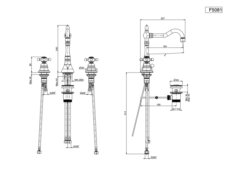 Смеситель для раковины, Fima Carlo Frattini, Elizabeth, тип открывания воды-вентильный, тип регулирования воды-керамическая кран-букса, монтаж-на раковину/столешницу, отверстия для монтажа-3, высота, мм-240, вынос излива, мм-184, тип излива-поворотный, донный клапан-есть, тип подводки-гибкая, стандарт подвода воды-3/8", цвет-античная бронза Смеситель для раковины, Fima Carlo Frattini, Elizabeth, цвет-античная бронза