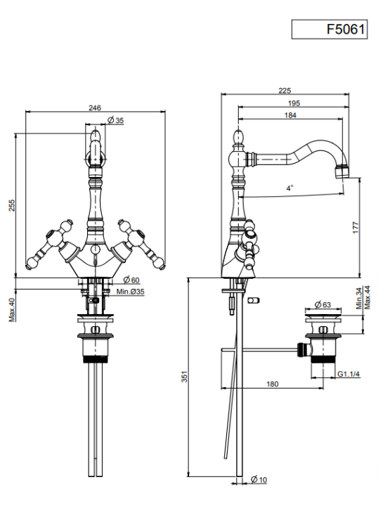 Смеситель для раковины, Fima Carlo Frattini, Epoque, тип открывания воды-двухвентильный, отверстия для монтажа-1, высота, мм-255, вынос излива, мм-184, тип излива-вращающийся, донный клапан-есть, тип подводки-гибкий, цвет-золото Смеситель для раковины, Fima Carlo Frattini, Epoque, цвет-золото