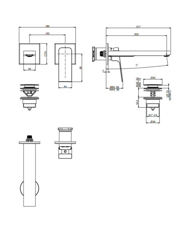 Смеситель для раковины, Fima Carlo Frattini, Fit, тип открывания воды-однорычажный, тип регулирования воды-керамический картридж, монтаж-настенный встраиваемый, отверстия для монтажа-2, высота, мм-70, вынос излива, мм-200, тип излива-неподвижный, донный клапан-есть click-clack 1``1/4, тип подводки-жесткая, внутренняя часть-необходимо заказать, цвет-хром Смеситель для раковины, Fima Carlo Frattini, Fit, цвет-хром