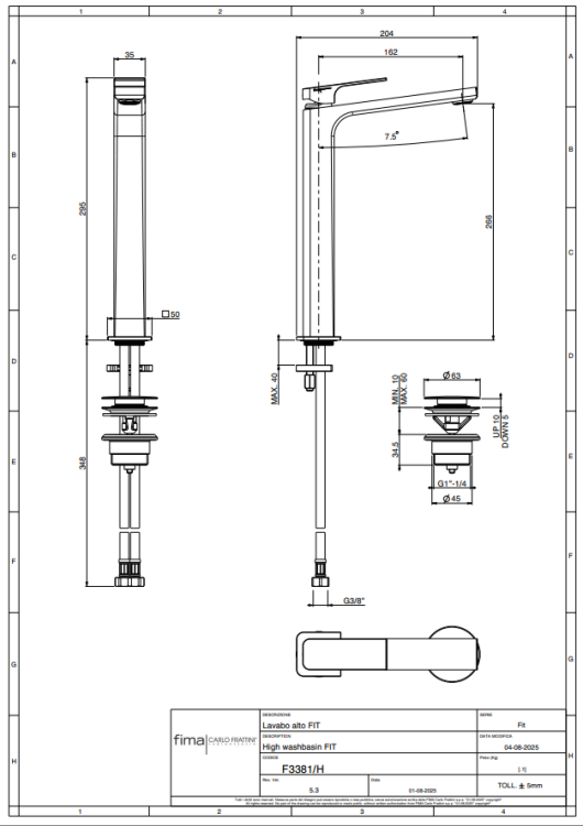 Смеситель для раковины, Fima Carlo Frattini, Fit, тип открывания воды-однорычажный, монтаж-на раковину/столешницу, отверстия для монтажа-1, высота, мм-294, вынос излива, мм-160, донный клапан-есть, click-clack, цвет-хром Смеситель для раковины, Fima Carlo Frattini, Fit, цвет-хром