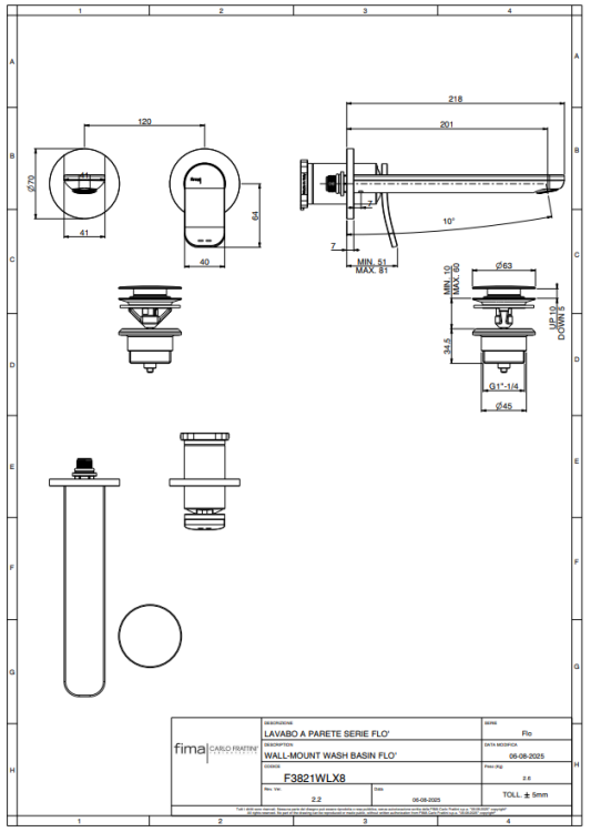 Смеситель для раковины, Fima Carlo Frattini, Flo', тип открывания воды-однорычажный, монтаж-настенный встраиваемый, отверстия для монтажа-2, высота, мм-70, вынос излива, мм-200, тип излива-неподвижный, донный клапан-есть, click-clack 1``1/4, тип подводки-жесткая, внутренняя часть-необходимо заказать, в комплекте-металлическая пластина, цвет-черный матовый Смеситель для раковины, Fima Carlo Frattini, Flo', цвет-черный матовый