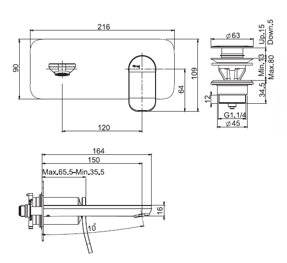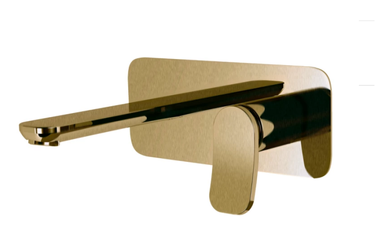 Смеситель для раковины, Fima Carlo Frattini, Flo', тип открывания воды-однорычажный, тип регулирования воды-керамический картридж, монтаж-настенный встраиваемый, отверстия для монтажа-2, высота, мм-109, вынос излива, мм-150, тип излива-неподвижный, донный клапан 1``1/4-есть, тип подводки-жесткая, внутренняя часть-необходимо заказать, в комплекте-металлическая пластина, цвет-золото брашированное Смеситель для раковины, Fima Carlo Frattini, Flo', цвет-золото брашированное