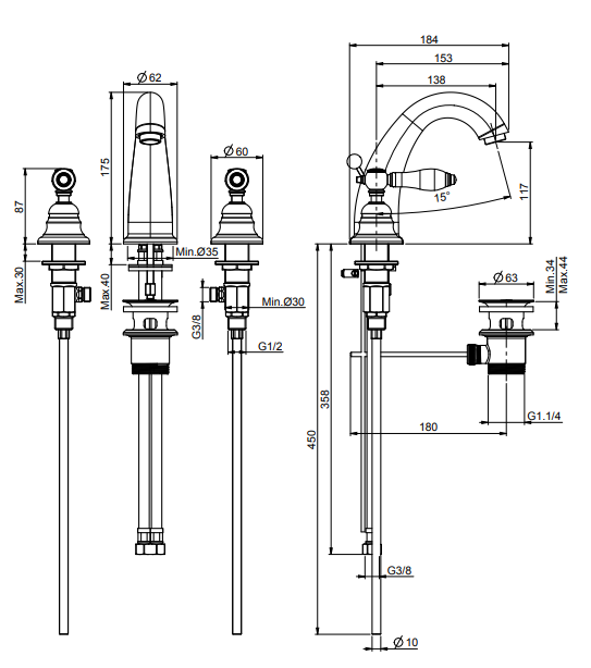 Смеситель для раковины, Fima Carlo Frattini, Herend, тип открывания воды-вентильный, тип регулирования воды-керамическая кран-букса, монтаж-на раковину/столешницу, отверстия для монтажа-3, высота, мм-175, вынос излива, мм-138, тип излива-неподвижный, материал ручки-керамика, цвет ручки-белый, донный клапан-есть, 1"1/4, тип подводки-гибкая, в комплекте с двумя гибкими шлангами, стандарт подвода воды-3/8", цвет-золото Смеситель для раковины, Fima Carlo Frattini, Herend, цвет-золото/белый