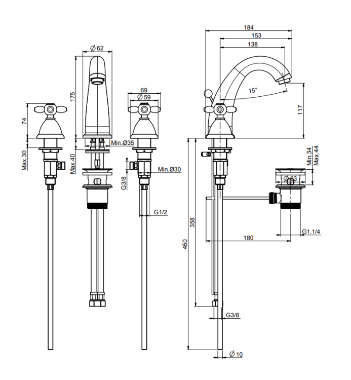 Смеситель для раковины, Fima Carlo Frattini, Olivia, тип открывания воды-вентильный, тип регулирования воды-керамическая кран-букса, монтаж-на раковину/столешницу, отверстия для монтажа-3, высота, мм-175, вынос излива, мм-138, тип излива-неподвижный, донный клапан-есть (1"1/4), тип подводки-гибкая, стандарт подвода воды-3/8", цвет-бронза античная Смеситель для раковины, Fima Carlo Frattini, Olivia, цвет-бронза античная