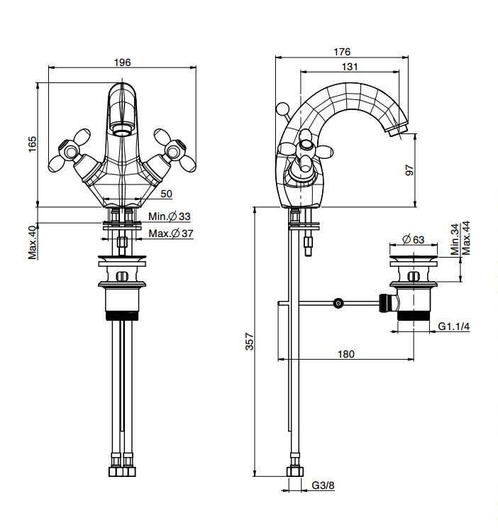 Смеситель для раковины, Fima Carlo Frattini, Olivia, тип открывания воды-вентильный, тип регулирования воды-керамическая кран-букса, монтаж-на раковину/столешницу, отверстия для монтажа-1, высота, мм-162, вынос излива, мм-132, тип излива-неподвижный, донный клапан-есть, 1"1/4, с двумя гибкими шлангами, мм-370, цвет-хром Смеситель для раковины, Fima Carlo Frattini, Olivia, цвет-хром