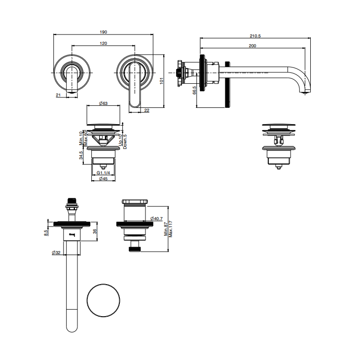 Смеситель для раковины, Fima Carlo Frattini, Park Lane, тип открывания воды-однорычажный, тип регулирования воды-керамический картридж, монтаж-настенный встраиваемый, отверстия для монтажа-2, высота, мм-101, вынос излива, мм-200, тип излива-неподвижный, донный клапан-есть, click-clack 1``1/4, тип подводки-жесткая, внутренняя часть-необходимо заказать, в комплекте-металлическая пластина, цвет-Brushed champagne Смеситель для раковины, Fima Carlo Frattini, Park Lane, цвет-Brushed champagne