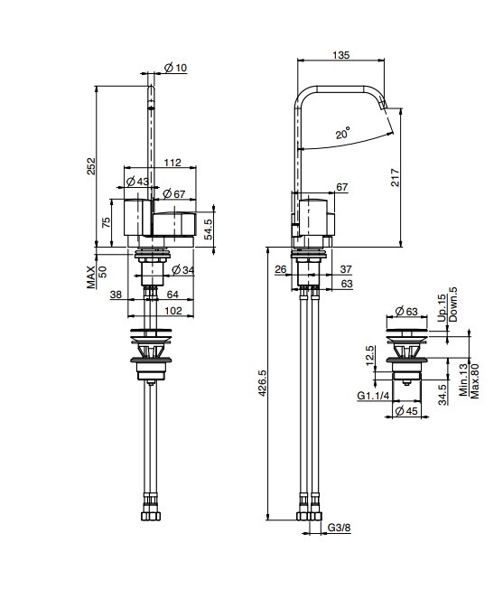 Смеситель для раковины, Fima Carlo Frattini, So, тип открывания воды-вентильный, тип регулирования воды-керамическая кран-букса, монтаж-на раковину/столешницу, отверстия для монтажа-1, высота, мм-252, вынос излива, мм-135, тип излива-поворотный, донный клапан-есть (click-clack 1``1/4), тип подводки-гибкая, стандарт подвода воды-3/8", с двумя гибкими шлангами, ручки-необходимо заказать, цвет-черный хром брашированный Смеситель для раковины, Fima Carlo Frattini, So, цвет-черный хром брашированный