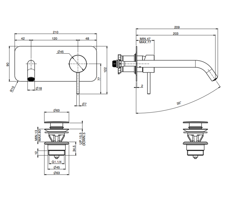 Смеситель для раковины, Fima Carlo Frattini, Spillo Up, тип открывания воды-однорычажный, тип регулирования воды-керамический картридж, монтаж-настенный, отверстия для монтажа-2, высота, мм-90, вынос излива, мм-203, тип излива-неподвижный, гигиенический душ-есть, донный клапан-есть click-clack 1``1/4, тип подводки-жесткая, внутренняя часть-необходимо заказать, цвет-никель брашированный Смеситель для раковины, Fima Carlo Frattini, Spillo Up, цвет-никель брашированный