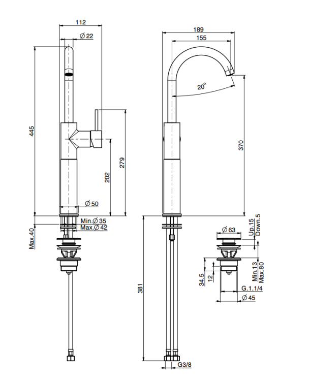 Смеситель для раковины, Fima Carlo Frattini, Spillo Up, тип открывания воды-однорычажный, тип регулирования воды-керамический картридж, монтаж-на раковину/столешницу, отверстия для монтажа-1, высота, мм-445, вынос излива, мм-155, тип излива-поворотный, с двумя гибкими шлангами, донный клапан-есть click-clack 1``1/4, тип подводки-гибкая, стандарт подвода воды-3/8", цвет-чёрный матовый Смеситель для раковины, Fima Carlo Frattini, Spillo Up, цвет-чёрный матовый