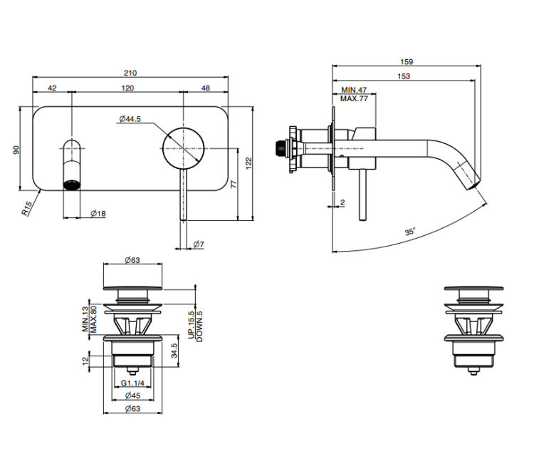 Смеситель для раковины, Fima Carlo Frattini, Spillo Up, тип открывания воды-однорычажный, тип регулирования воды-керамический картридж, монтаж-настенный встраиваемый, отверстия для монтажа-2, высота, мм-122, вынос излива, мм-150, тип излива-неподвижный, донный клапан-есть click-clack 1``1/4, тип подводки-жесткая, внутренняя часть-необходимо заказать, цвет-хром Смеситель для раковины, Fima Carlo Frattini, Spillo Up, цвет-хром