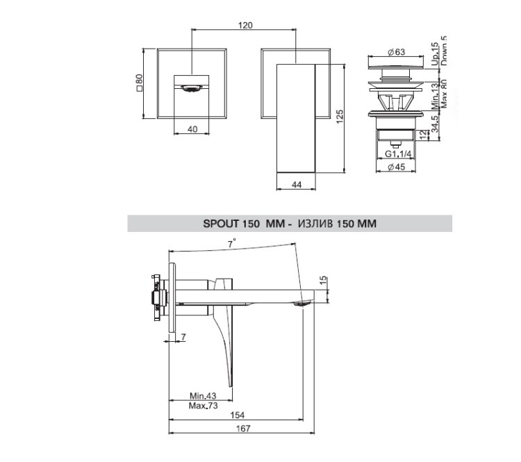 Смеситель для раковины, Fima Carlo Frattini, Zeta, тип открывания воды-однорычажный, монтаж-настенный встраиваемый, отверстия для монтажа-2, вынос излива, мм-154, донный клапан-есть, внутренняя часть-необходимо заказать, цвет-хром Смеситель для раковины, Fima Carlo Frattini, Zeta, цвет-хром