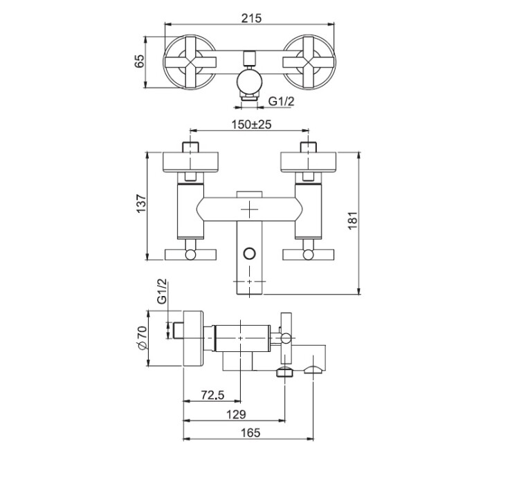 Смеситель для ванны и душа, Fima Carlo Frattini, Maxima, тип открывания воды-вентильный, монтаж-настенный, отверстия для монтажа-2, вынос излива, мм-165, 2 подвода воды 1/2" с эксцентриком, переключатель, цвет-хром Смеситель для ванны и душа, Fima Carlo Frattini, Maxima, цвет-хром