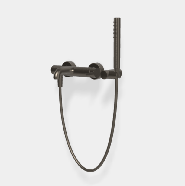 Смеситель для ванны и душа, Fima Carlo Frattini, Snap, тип открывания воды-однорычажный, тип регулирования воды-керамический картридж, монтаж-настенный, отверстия для монтажа-3, вынос излива, мм-169, ручной душ и держатель для душа-в комплекте, ручной душ с защитой от извести анти-кальк, 2 подвода воды 1/2 с эксцентриком, кнопочный переключатель, гибкий шланг хромалюкс 1500 мм, цвет-брашированный черный хром Смеситель для ванны и душа, Fima Carlo Frattini, Snap, цвет-брашированный черный хром