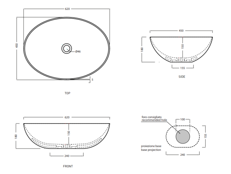 Раковина, CIELO, Era, ширина, мм-620, глубина, мм-450, высота, мм-180, тип установки-под столешницу, отверстия для смесителя-отсутствуют, цвет-Polvere, все стороны покрыты эмалью Раковина, CIELO, Era, шгв 620*450*180, отверстия для смесителя-отсутствуют, цвет-Polvere