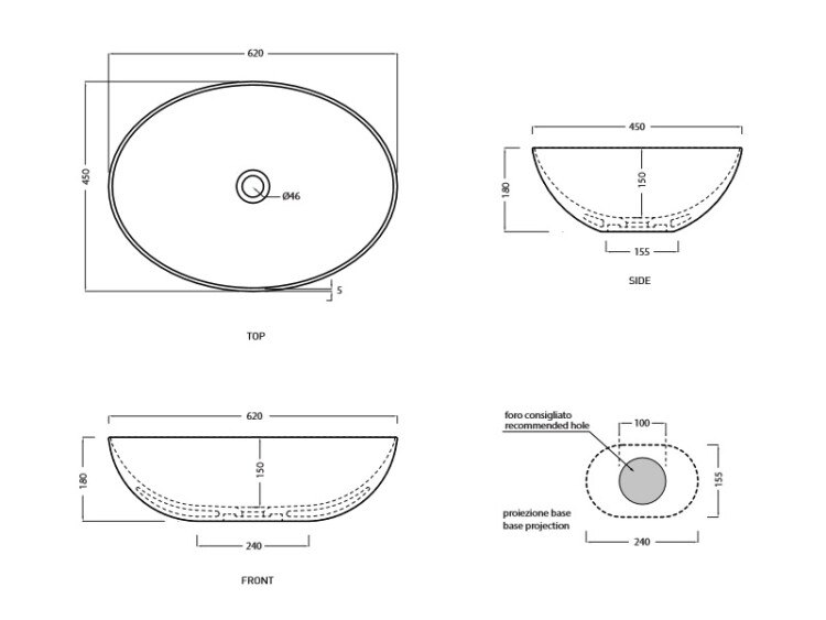 Раковина, CIELO, Era, ширина, мм-620, глубина, мм-450, высота, мм-180, тип установки-на столешницу, отверстия для смесителя-отсутствуют, материал-керамика, цвет-Talco, овальная, все стороны покрыты эмалью Раковина, CIELO, Era, шгв 620*450*180, отверстия для смесителя-отсутствуют, цвет-Talco