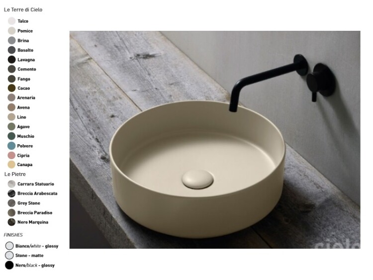 Раковина, CIELO, Shui Comfort, ширина, мм-400, глубина, мм-400, высота, мм-125, тип установки-на столешницу, отверстия для смесителя-отсутствуют, материал-керамика, цвет-Muschio, круглая, все стороны покрыты эмалью Раковина, CIELO, Shui Comfort, шгв 400*400*125, отверстия для смесителя-отсутствуют, цвет-Muschio