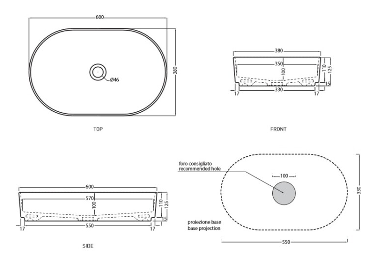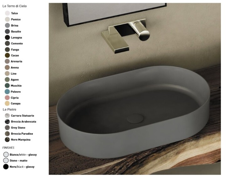 Раковина, CIELO, Shui Comfort, ширина, мм-600, глубина, мм-380, высота, мм-125, тип установки-на столешницу, отверстия для смесителя-отсутствуют, материал-керамика, цвет-Brina, овальная, все стороны покрыты эмалью Раковина, CIELO, Shui Comfort, шгв 600*380*125, отверстия для смесителя-отсутствуют, цвет-Brina