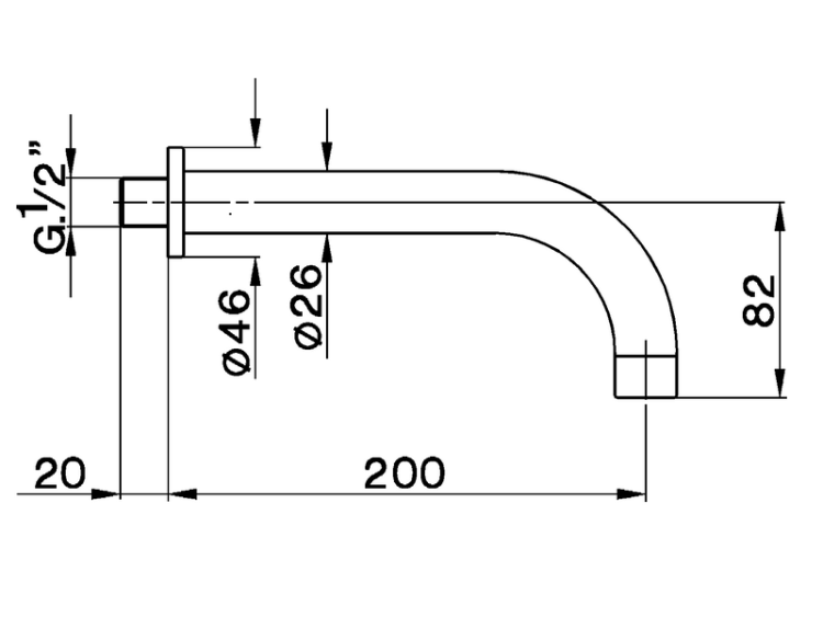 Излив, Cisal, Complemente, тип установки-настенный, вынос излива, мм-200, стандарт подводки-1/2", цвет-хром Излив, Cisal, Complemente, цвет-хром