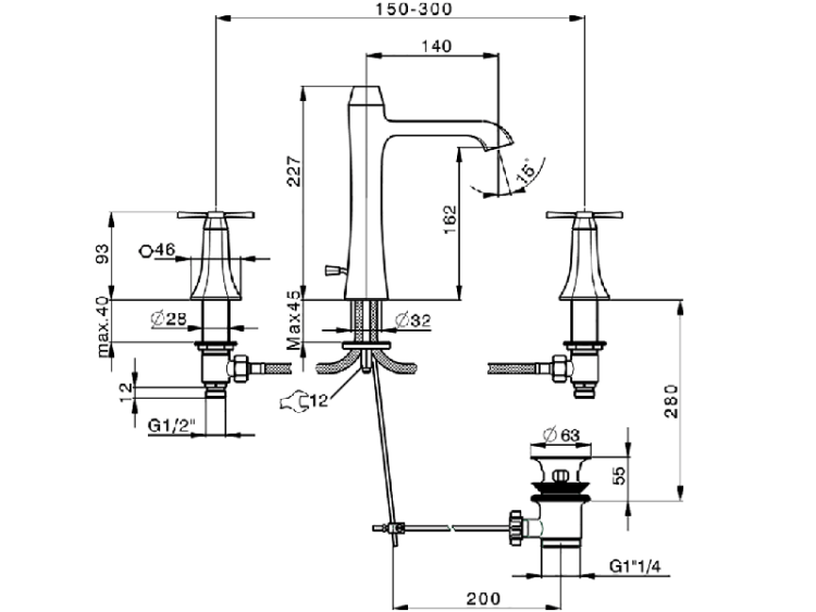 Смеситель для раковины, Cisal, Chérie, тип открывания воды-двухвентильный, отверстия для монтажа-3, высота, мм-227, вынос излива, мм-140, донный клапан-есть, цвет-Chrome/Night Black Смеситель для раковины, Cisal, Chérie, цвет-Chrome/Night Black