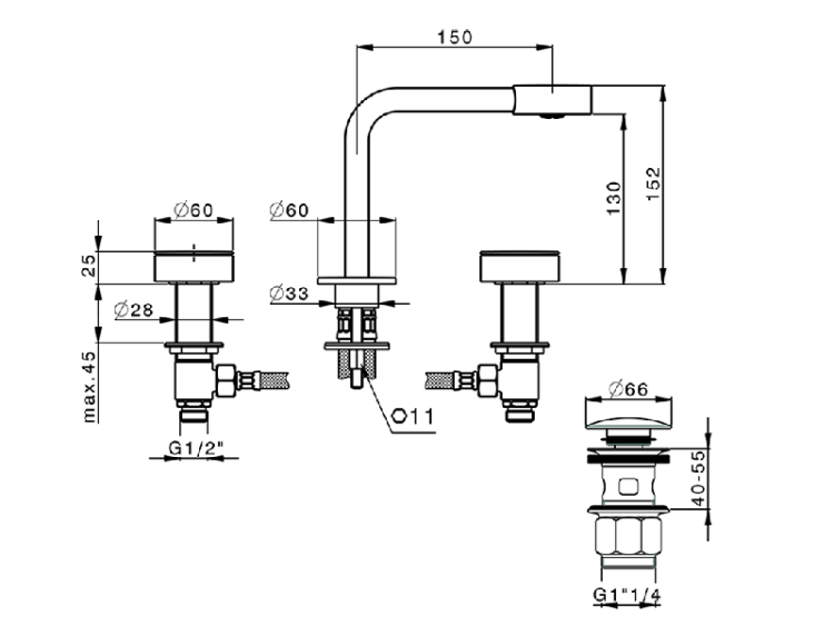 Смеситель для раковины, Cisal, Slim, тип открывания воды-двухвентильный, отверстия для монтажа-3, высота, мм-152, вынос излива, мм-150, донный клапан-есть, цвет-Matt Black Смеситель для раковины, Cisal, Slim, цвет-Matt Black