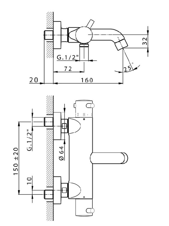 Смеситель для ванны и душа, Cisal, Less New, тип открывания воды-двухрычажный, тип установки-настенный, вынос излива, мм-160, цвет-Matt Black Смеситель для ванны и душа, Cisal, Less New, цвет-Matt Black