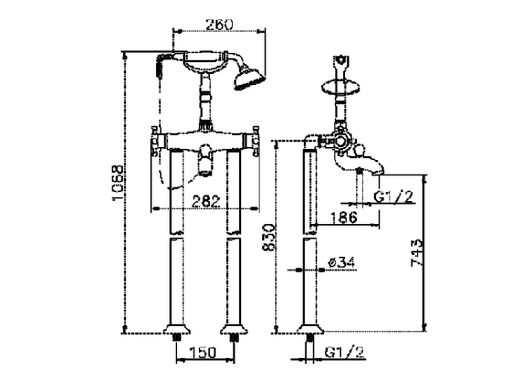 Смеситель для ванны и душа, Cisal, Victorian, тип регулирования воды-термостатический картридж, тип установки-напольный, отверстия для монтажа-2, вынос излива, мм-186, цвет-Old Bronze, комплектация-ручной душ, держатель ручного душа Смеситель для ванны и душа, Cisal, Victorian, цвет-Old Bronze