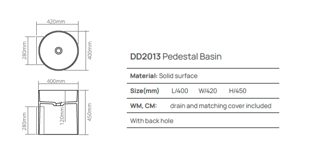 Раковина, DEA Design, Pedestal Basin, ширина, мм-400, глубина, мм-420, высота, мм-450, тип установки-напольный, отверстия для смесителя-отсутствуют, без перелива, материал-Solid surface, цвет-белый матовый Раковина, DEA Design, Pedestal Basin, шгв 400*420*450, отверстия для смесителя-отсутствуют, цвет-белый матовый