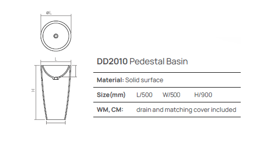 Раковина, DEA Design, Pedestal Basin, ширина, мм-500, глубина, мм-500, высота, мм-900, тип установки-напольный, отверстия для смесителя-отсутствуют, без перелива, материал-Solid surface, цвет-белый матовый Раковина, DEA Design, Pedestal Basin, шгв 500*500*900, отверстия для смесителя-отсутствуют, цвет-белый матовый
