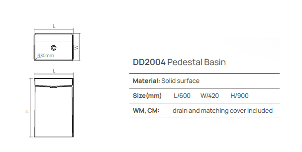 Раковина, DEA Design, Pedestal Basin, ширина, мм-600, глубина, мм-420, высота, мм-900, тип установки-напольный, отверстия для смесителя-отсутствуют, без перелива, материал-Solid surface, цвет-белый матовый Раковина, DEA Design, Pedestal Basin, шгв 600*420*900, отверстия для смесителя-отсутствуют, цвет-белый матовый