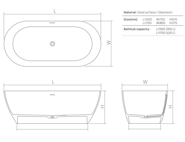 Ванна, DEA Design, Edge, ширина, мм-1700, глубина, мм-800, высота, мм-575, водоизмещение (л)-420, тип установки-отдельностоящий, форма-овальная, материал-Solid surface, цвет-белый матовый Ванна, DEA Design, Edge, шгв 1700*800*575, цвет-белый матовый