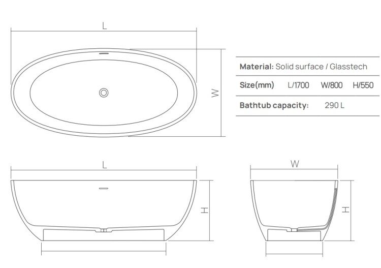 Ванна, DEA Design, Nature, ширина, мм-1700, глубина, мм-800, высота, мм-550, водоизмещение (л)-290, тип установки-отдельностоящий, форма-овальная, материал-Solid surface, цвет-белый матовый (Matt White, Bianco Opaco) Ванна, DEA Design, Nature, шгв 1700*800*550, цвет-белый матовый (Matt White, Bianco Opaco)