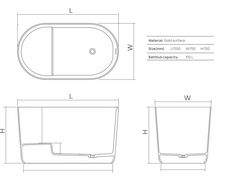 Ванна, DEA Design, Single, ширина, мм-1350, глубина, мм-750, высота, мм-750, водоизмещение (л)-310, тип установки-отдельностоящий, форма-овальная, панель-есть, материал-Solid surface, цвет-белый матовый (Matt White, Bianco Opaco) Ванна, DEA Design, Single, шгв 1350*750*750, цвет-белый матовый (Matt White, Bianco Opaco)