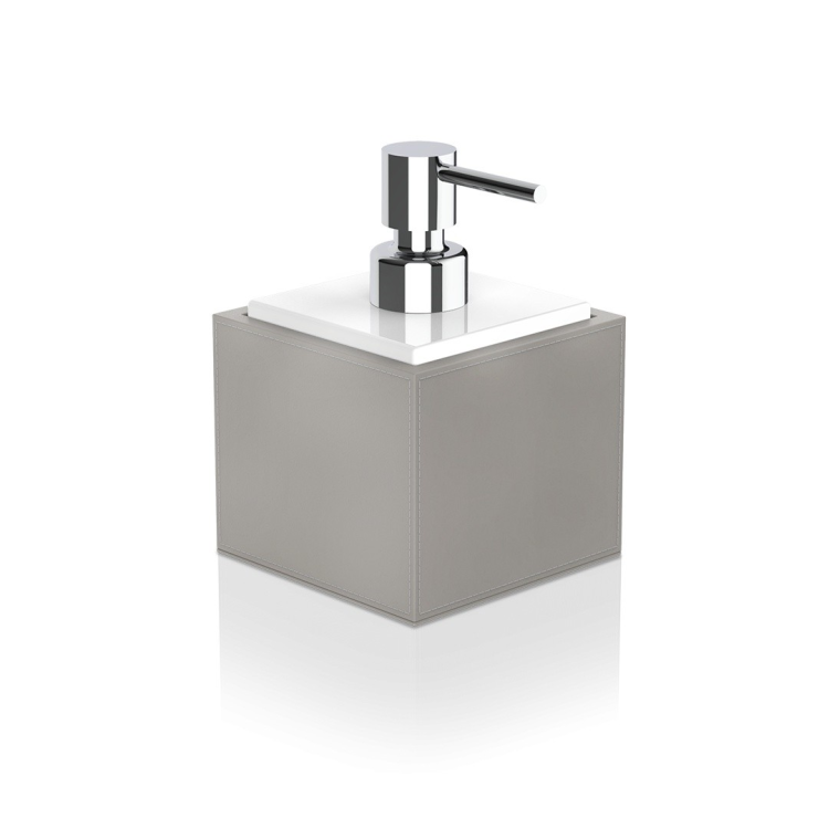 Дозатор для жидкого мыла, Decor Walther, Brownie, механический (нажимной), ширина, мм-99, глубина, мм-99, высота, мм-147, ёмкость(мл)-400, тип установки-настольный (свободностоящий), материал колбы-фарфор/искусственная кожа, цвет колбы-белый фарфор/тауп (имитация кожи), материал дозатора-металл, цвет дозатора-хром Дозатор для жидкого мыла, Decor Walther, Brownie, шгв 99*99*147, цвет дозатора-хром/тауп