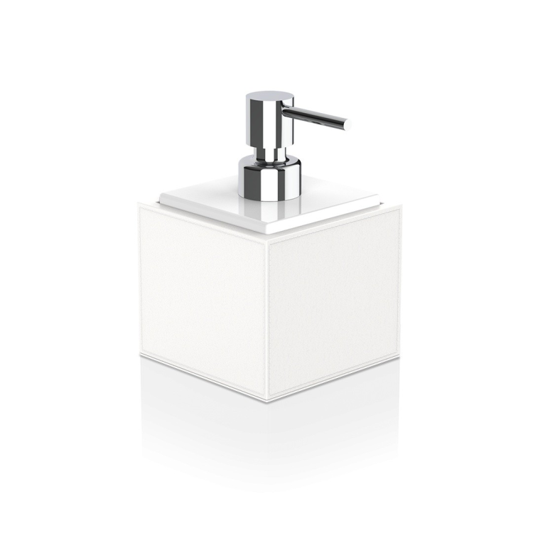 Дозатор для жидкого мыла, Decor Walther, Brownie, механический (нажимной), ширина, мм-99, глубина, мм-99, высота, мм-147, ёмкость(мл)-400, тип установки-настольный (свободностоящий), материал колбы-фарфор белый/искусственная кожа, цвет колбы-белый (имитация кожи), цвет дозатора-хром Дозатор для жидкого мыла, Decor Walther, Brownie, шгв 99*99*147, цвет-хром/белый