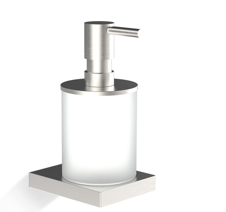 Дозатор для жидкого мыла, Decor Walther, Contract, механический (нажимной), ширина, мм-80, глубина, мм-110, высота, мм-160, тип установки-настенный, материал колбы-стекло, цвет колбы-матовый, цвет дозатора-сталь матовая PVD Дозатор для жидкого мыла, Decor Walther, Contract, шгв 80*110*160, цвет дозатора-сталь матовая PVD