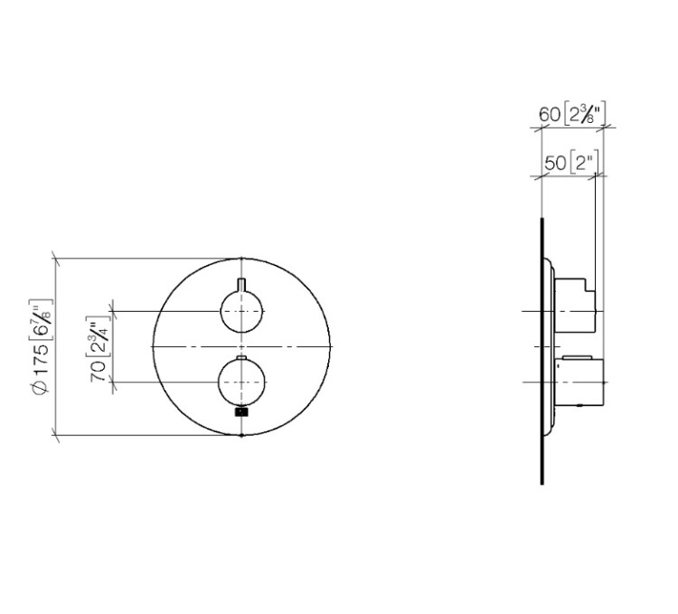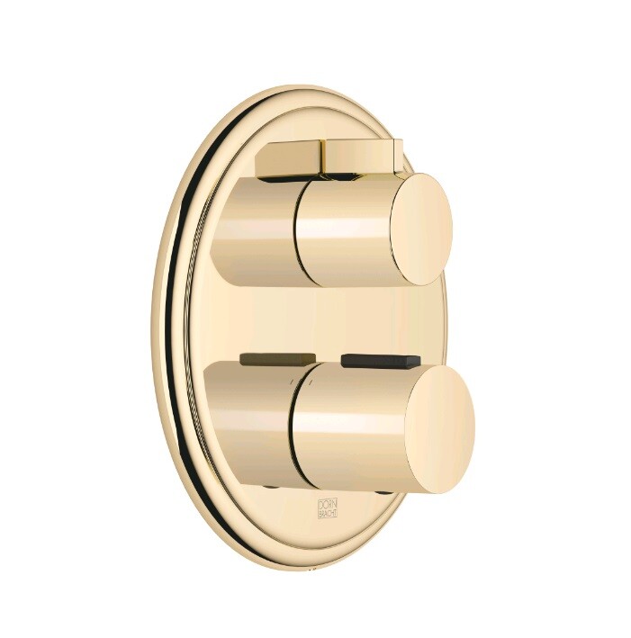 Смеситель для душа, Dornbracht, Madison, тип открывания воды-вентильный, тип регулирования воды-термостатический картридж, тип установки-встраиваемый, отверстия для монтажа-2, внутренняя часть-необходимо заказать, без регулирования расхода, с односторонней регулировкой объема подачи воды, накладная панель диаметр,мм-175, ручка со шкалой и стопором на 38°C, ограничитель температуры горячей воды, предварительно настраиваемый, цвет-латунь Смеситель для душа, Dornbracht, Madison, на 1 потребитель, цвет-латунь