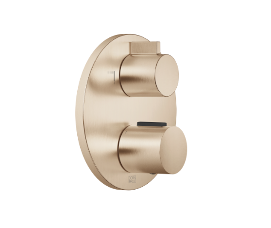 Смеситель для душа, Dornbracht, Series specific, тип открывания воды-вентильный, тип регулирования воды-термостатический картридж, тип установки-настенный встраиваемый, внутренняя часть-необходимо заказать, цвет-золото светлое сатинированное, с двухсторонней регулировкой объема подачи воды, накладная панель диметр,мм-150, ручка со шкалой и стопором на 38°, ограничитель температуры горячей воды, предварительно настраиваемый Смеситель для душа, Dornbracht, Series specific, цвет-золото светлое сатинированное