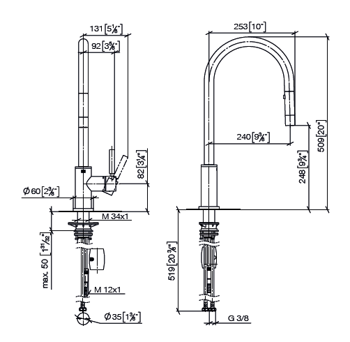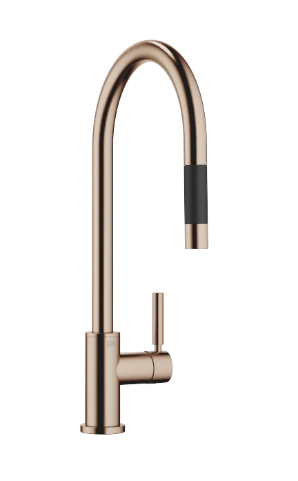 Смеситель для кухни, Dornbracht, Tara, с функцией душа, тип открывания воды-однорычажный, тип регулирования воды-керамический картридж, монтаж-на раковину/столешницу, отверстия для монтажа-1, высота, мм-509, вынос излива, мм-240, тип излива-поворотный, тип подводки-гибкая, стандарт подвода воды-3/8", типы струй-ламинарная и душевая, поверхность с форсунками с системой защиты от известковых отложений, в комплекте-металлический шланг для душа 1800 мм, цвет-бронза сатинированная Смеситель для кухни, Dornbracht, Tara, с функцией душа, цвет-бронза сатинированная